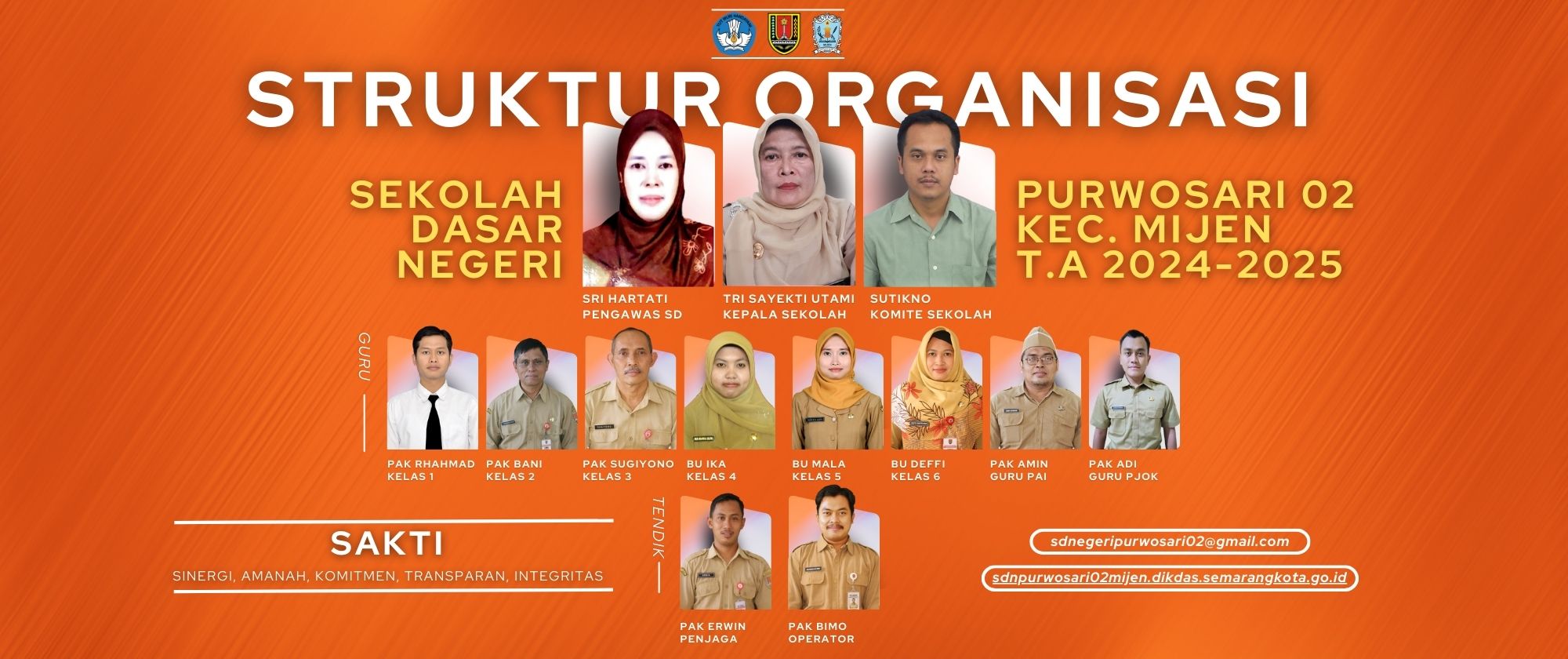 Seraya memanjatkan puji syukur ke hadirat Tuhan yang Maha Esa, disertai perasaan bangga saya menuliskan kata sambutan Kepala sekolah, dalam rangka penerbitan Website sekolah. Di era global dan pesatnya Teknologi Informasi ini, tidak dipungkiri bahwa keberadaan sebuah website untuk suatu organisasi, termasuk SD NEGERI PURWOSARI 02 MIJEN , sangatlah penting. Wahana website dapat digunakan sebagai media penyebarluasan informasi-informasi dari sekolah, yang memang harus diketahui oleh stake holder secara luas. Disamping itu, website juga dapat menjadi sarana promosi sekolah yang cukup efektif. Berbagai kegiatan positif sekolah dapat diunggah, disertai gambar-gambar yang relevan, sehingga masyarakat dapat mengetahui prestasi-prestasi yang telah berhasil diraih oleh SD NEGERI PURWOSARI 02 MIJEN.